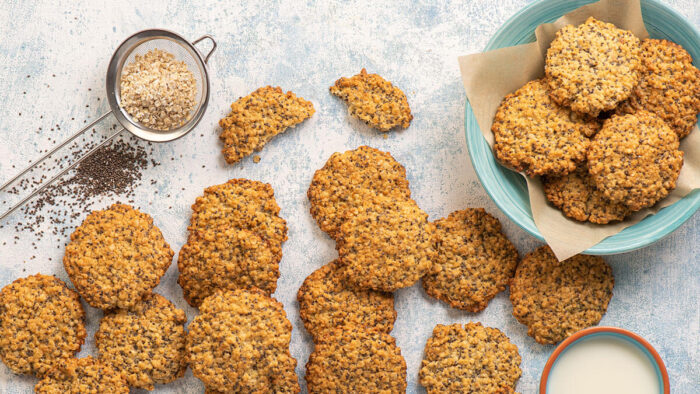 Semințele de chia pot fi adăugate în aluaturi pentru pâine, biscuiți sau clătite, sporind aportul de fibre și proteine. O rețetă simplă de biscuiți sănătoși: