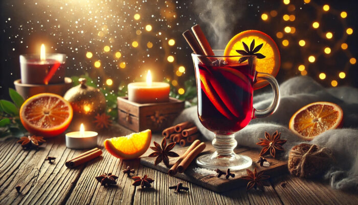 Imaginea de mai sus redă perfect atmosfera de sărbătoare și farmecul vinului fiert, punând accent pe condimente și căldura sa reconfortantă.