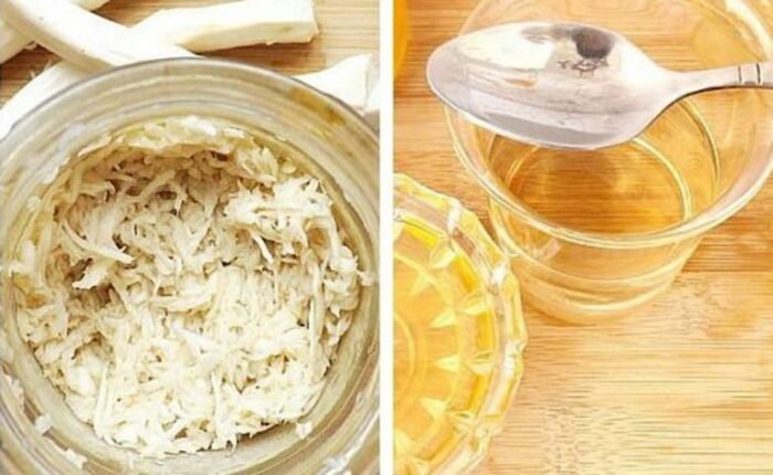 1. Amestecă hreanul ras cu mierea într-un borcan.