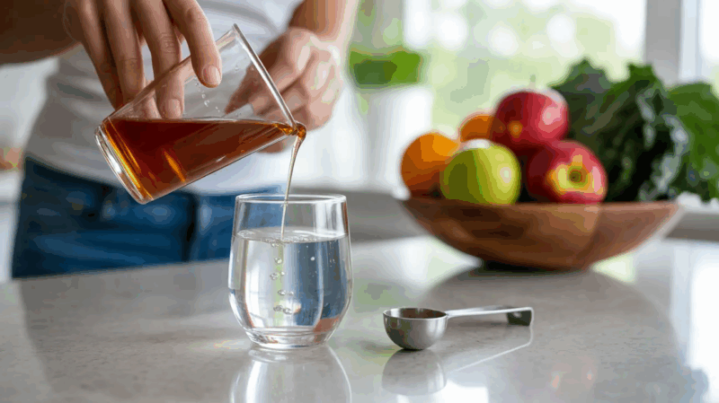 • Se diluează 1–2 lingurițe de oțet de mere într-un pahar mic cu apă (aprox. 60–100 ml).